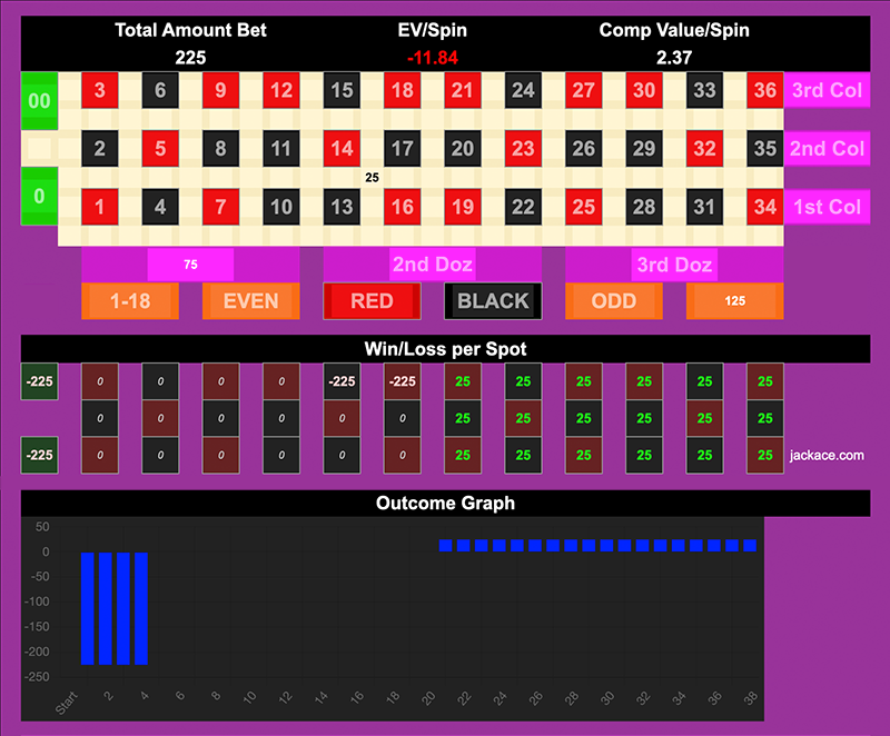 $0 | $900 | -$900 | 5:01 | Alex bought in AGAIN for another $900 and Martingaled. Alex also accidentally was betting on 1-18 here along with the 19-36 bet. |