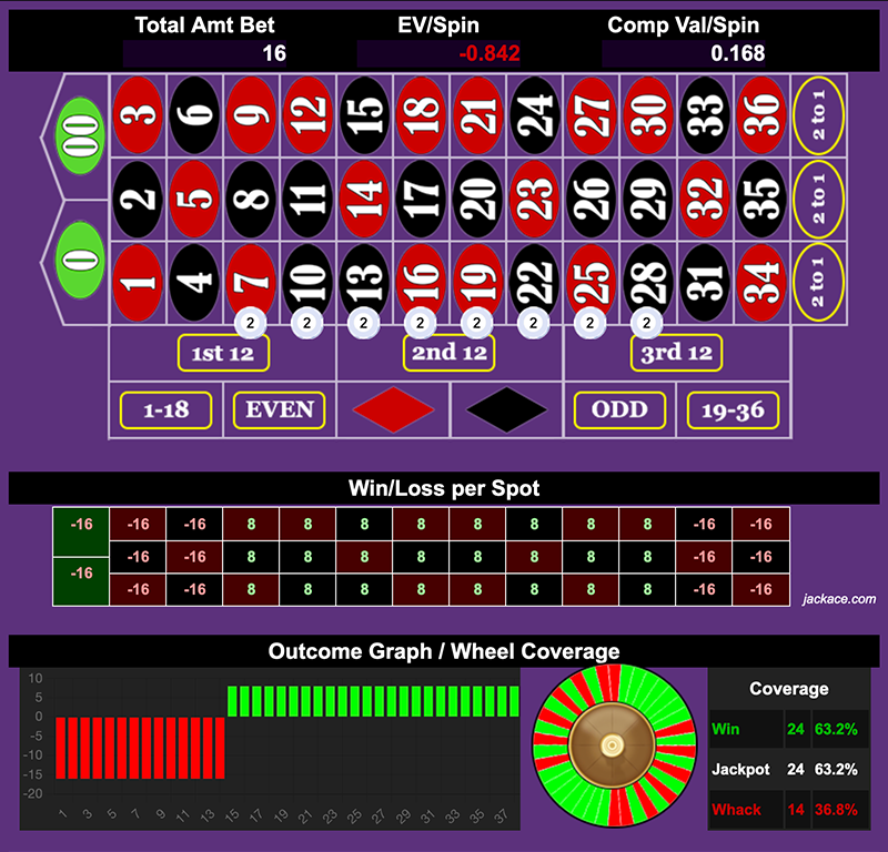8 individual D'Alembert legs. When a street misses, increase by $1. When a street hits, decrease by $1(?)